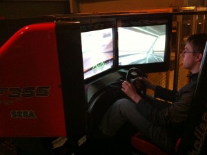 So let’s look at the differences. First, like Sega Rally Championship, you are in the car. This time, this is displayed with three screens and a slightly more immersive surrounding, which is quite cool (which is as close to feeling that you are in an actual car that has ever really been done… motion controls included). There’s an optional gear change and steering wheel that pushes back. There’s also a few nice helpful buttons – ABS can be enabled or disabled with a push on a button. It’s quite nice and cool, something we’ve seen in arcades before, but it feels a bit better executed here.