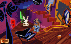 The true star and focus of this is Max. While Sam is the straight man, funny but focused, Max is outrageous, suggesting violence as the only possible solution and if he’s not threatening physical abuse, he’s taking it from Sam… taking it with a smile and enjoying himself as he does it. In other games it might seem wrong, and the bunny would be the cute one, but here it’s just slapstick enough to be funny at every turn. I think the razor sharp teeth and fuzzy exterior may help there. And while you’d think it troubling if he looked serious, he’s just so cute that you want to cuddle him… assuming he’s not holding a knife first. I’d also require a muzzle and a sedative. My point still stands.